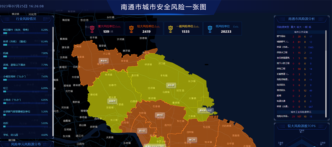 針對南通市3區(qū)、1縣和3縣級市全域開展風險辨識和評估,包括材料收集、走訪調(diào)查、建設(shè)城市風險平臺、線上填報、風險評估和現(xiàn)場復(fù)核等。